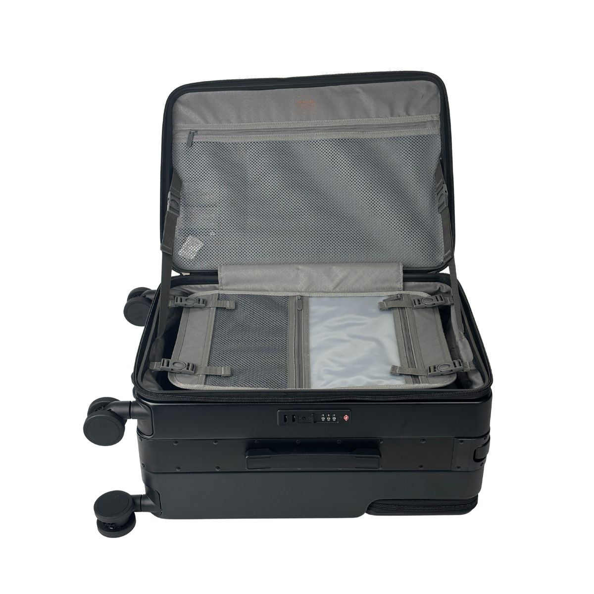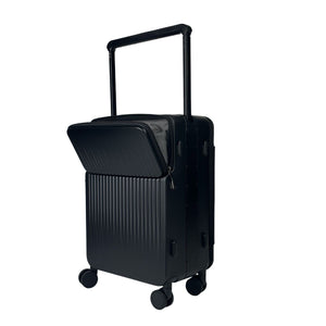 The matte black finish projects understated confidence, while the interior’s side-opening layout provides flexible space for suits, shoes, and accessories. Double zippers, a TSA-approved lock, and shock-absorbing TPE wheels ensure security and smooth performance throughout demanding journeys.