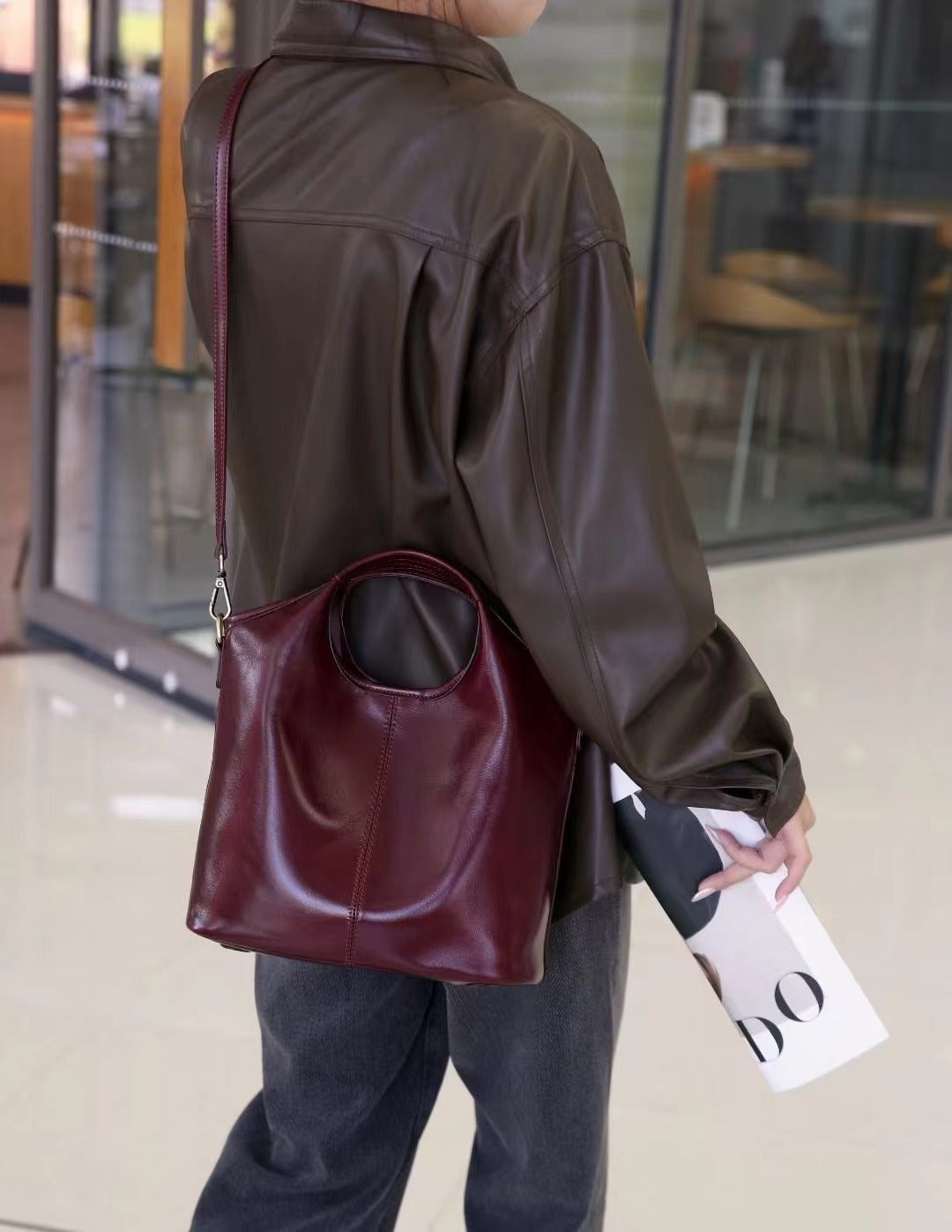 Designed for modern women who want both elegance and practicality, this leather bucket shoulder bag offers a spacious interior in a clean, minimal silhouette. Crafted from premium cowhide leather, it features a soft yet structured form that pairs effortlessly with blazers, coats, knitwear and everyday outfits.
