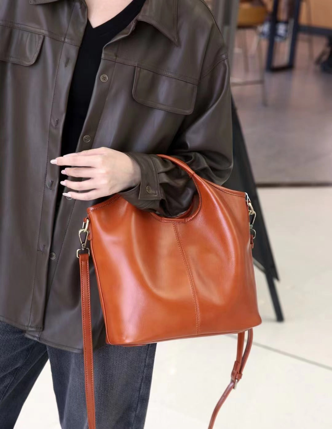 Designed for modern women who want both elegance and practicality, this leather bucket shoulder bag offers a spacious interior in a clean, minimal silhouette. Crafted from premium cowhide leather, it features a soft yet structured form that pairs effortlessly with blazers, coats, knitwear and everyday outfits.