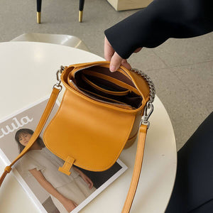 Elegant, compact and effortlessly stylish, this mini leather bucket crossbody bag brings a refined touch to your everyday wardrobe. Crafted from premium cowhide leather, it features a structured silhouette with a chic chain accent, giving it a polished, modern look that pairs beautifully with blazers, knitwear, denim and dresses.