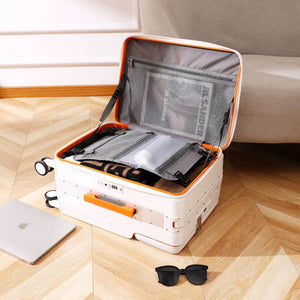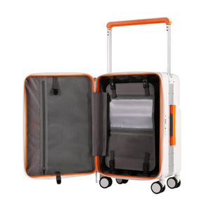 A bright, clean design complemented by an aluminium alloy frame creates a premium visual appeal. The spacious side-opening compartment, complete with detachable divider and PVC wet bag, offers organised flexibility. Smooth TPE wheels and TSA-approved security make every journey effortless.